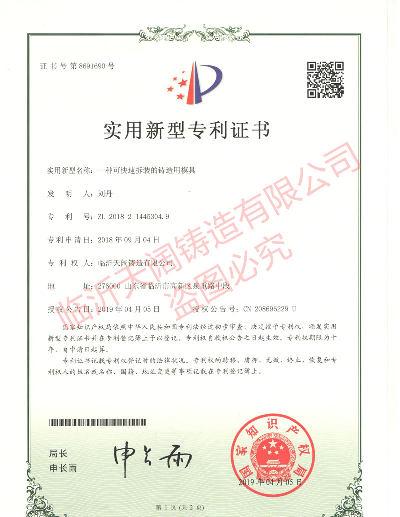 ★一种可快速拆装的铸造模具 (证书号 第8691690号)