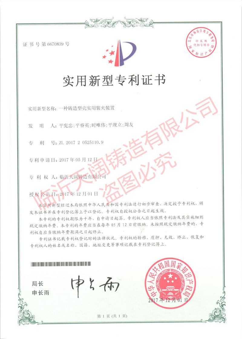 ★一种铸造型壳实用装夹装置 (证书号 第6670839号)