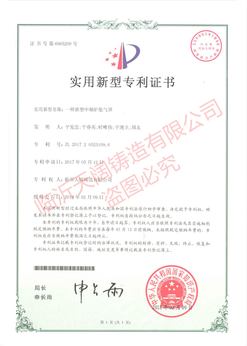 ★一种新型中频炉集气罩 (证书号 第6965200号)